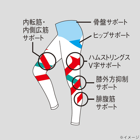 ●歩行に関係する筋肉をコンプレッションしながら下肢全体をサポート+骨盤を安定させるため骨盤を囲むようにコンプレッションを加えサポート。