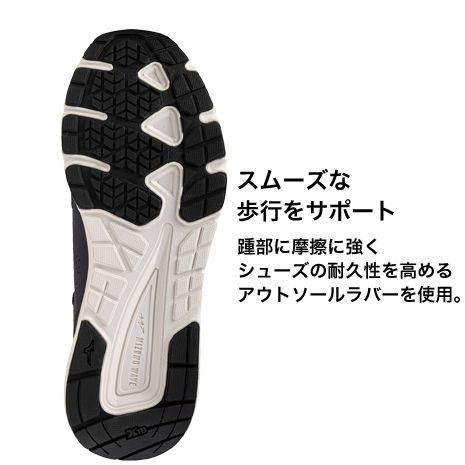 ソールに波のような構造を入れることで、クッション性と安定性を両立。