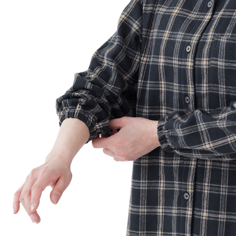 身頃裏側は全面フリース素材で暖かく、袖裏側はフリースなしで上着を着ても窮屈になりにくい仕様になっています。袖口は家事仕事の際にも便利な、袖を上げやすいゴム仕様です。サッと羽織れてお尻まで隠れるロング丈もポイントです。
