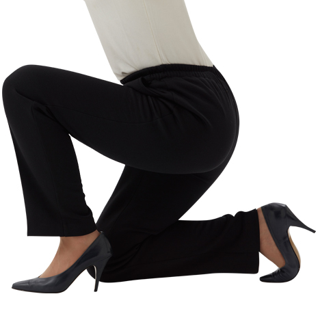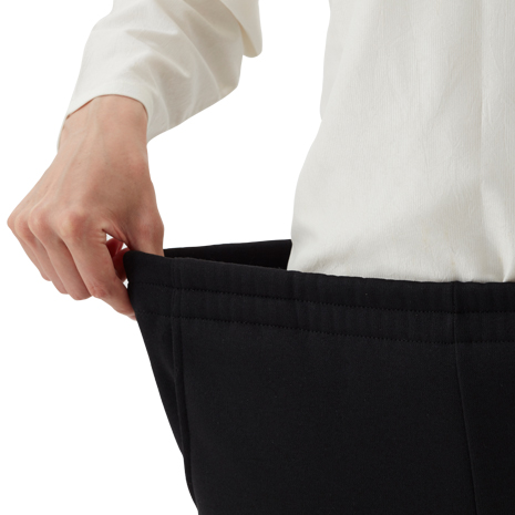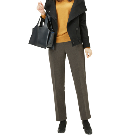 ヒップまわりはゆったりしていて、すらっとした美脚ラインのパンツです。ウエストは総ゴム仕様でゆったり履けて着脱もしやすいです。伸縮のあるニット素材ではき心地もらくらく。