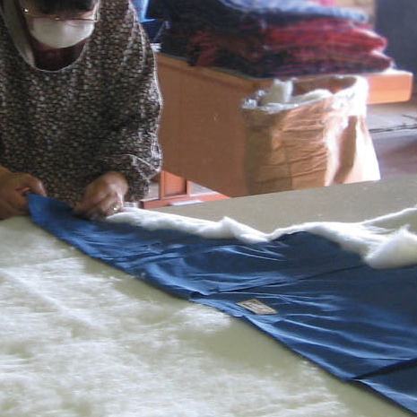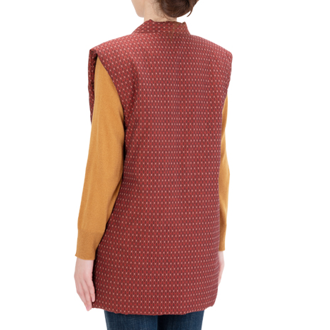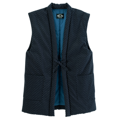 中わたがしっかり詰まった久留米織のちゃんちゃんこ。生地の織りから、わた入れ・縫製に至るまで一貫した国内生産です。袖がないので動きやすく、水仕事なども便利です。お尻まですっぽり覆う長めの丈。