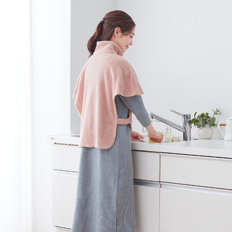 お家でのくつろぎ時間や就寝時を暖かく過ごせる着るブランケット。肩をすっぽり包み込み、高めの襟で首もとの冷えを防ぎます。後ろ側は長めの丈で腰あたりまでカバー。やわらかな毛布素材で着心地快適。