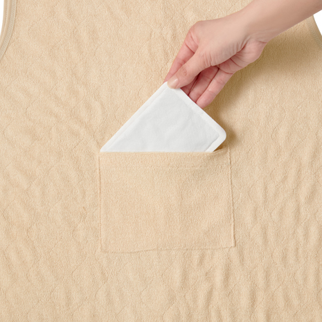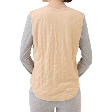 前開きのスナップボタン仕様で着脱簡単な薄手のインナーベストです。空気層を作って体温を逃しにくくするキルト加工です。内側のパイル生地には吸湿発熱作用のある素材を使用していて、腰部分の内側にはカイロが入るポケット付き。後ろ側は長めの丈感で腰をしっかり包みこみます。よくのびるため着心地もらくらくです。