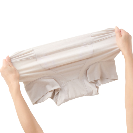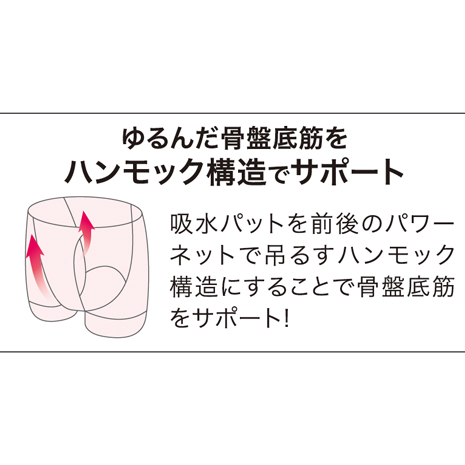 軽失禁対策ショーツです。吸水パッドを前後のパワーネットで吊るすハンモック構造にすることで骨盤底筋を下からサポート。骨盤まわりにもパワーネットを使用した快適な引き締め感で、肌ざわりのいい綿混ストレッチ素材です。