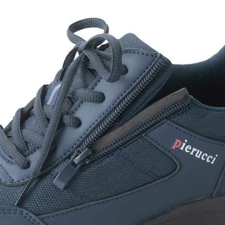 軽量で脱ぎ履きしやすいようにサイドファスナー仕様のウォーキングシューズです。かかと部分とストラップに反射材がついており夜間の歩行をサポート。靴ひもで足にぴったりフィットしつつ、普段の着脱はサイドファスナーで簡単に出来ます。足入れがゆったりとしていてワイズは4Eのため着脱が簡単です。トゥスプリングをやや高くすることで、次の一歩を踏み出しやすいよう軽快な歩行をサポートします。履き口は足首を保護するパッド付です。