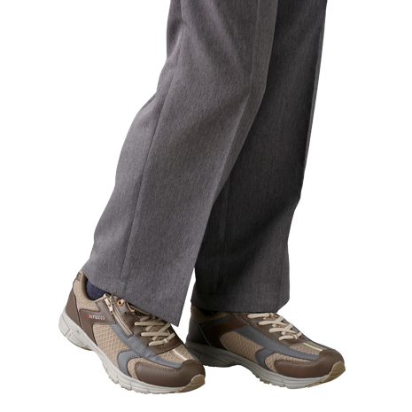 アウトソールはグリップ性に優れた合成ゴムを使用し、すべりにくい仕様です。また軽量で屈曲性に優れ滑りにくい素材を使用しています。足入れは靴ひもとサイドファスナーで脱ぎ履きが簡単で、足幅は幅広の4Eサイズで足入れゆったり。履き口には足首を保護するパッド付き。かかと部分に光反射材を使用し、夜間の歩行をサポートします。