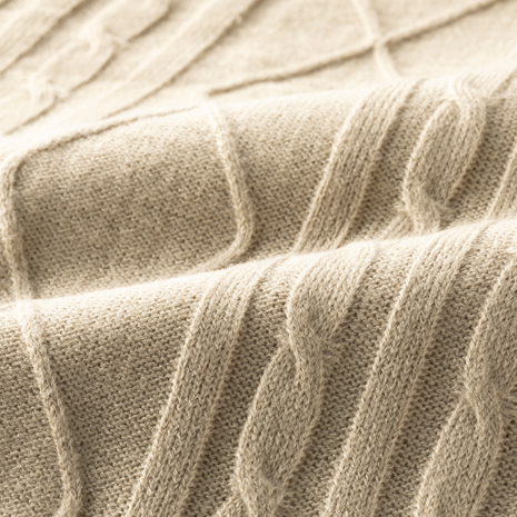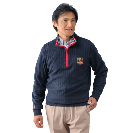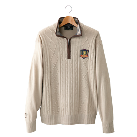 冬のカジュアルスタイルにぴったりのハーフジップセーター。やわらかな手触りの高級感溢れるケーブル編みのセーターです。前身頃にあしらった立体的なケーブル編みが高級感をアップさせます。デザインは人気のハーフジップタイプで、脱ぎ着がラクラクです。