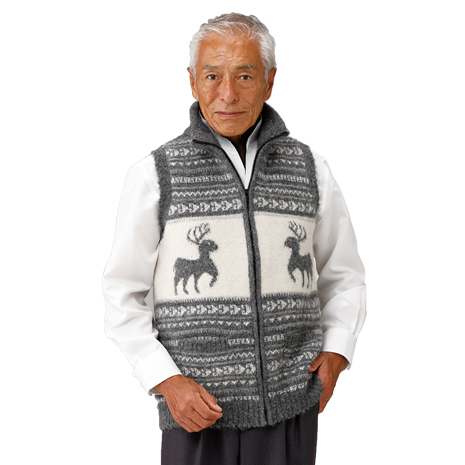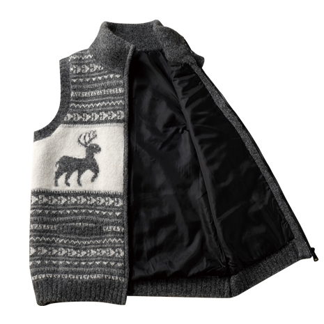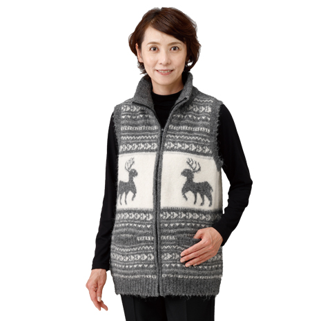 アルパカ混素材を使用した、スタンダードなデザインのジッパータイプのベストです。動物をモチーフにした、暖かみのあるお洒落なデザインで、保温性に優れたアルパカを混紡しました。寒さ調節にかかせないベストは肌寒い秋から春先まで長期間大活躍いたします。総裏地付きなのでインナーウェアとの引っ掛かりも少なく着脱もスムーズです。男女兼用ですのでサイズをお選びください。