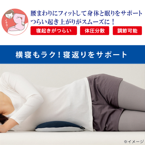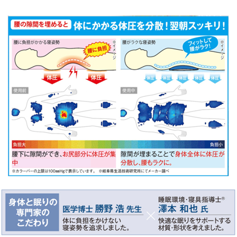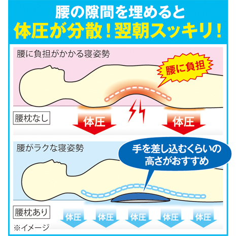 腰のお悩みは腰と布団の隙間が原因かも!?整形外科医の勝野浩先生と睡眠環境・寝具指導士(R)澤本和也氏、二人の専門家が共同監修しました。腰まくらが布団と腰との隙間を埋めて自然なS字形状を保ち、腰への負担が少ない眠りをサポートします。腰まくらは低さが肝心。高いと逆に腰を痛めてしまいます。手を差し込んだくらいが、ちょうど良いご自身の高さです。独自形状で自在に高さ調節ができるため、自分にぴったりの高さで心地良い寝姿勢に調整してご使用ください。中材は弾力性と通気性を兼ねたソフトパイプを使用しているため寝返りもサポート!吸水速乾性に優れた生地と立体メッシュ生地を使用していて、汗をかいても蒸れにくくサラッとした肌触りです。洗濯機で丸洗いOKでお手入れも簡単。表・裏どちら側でもご使用いただけます。男女兼用です。