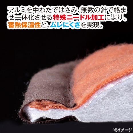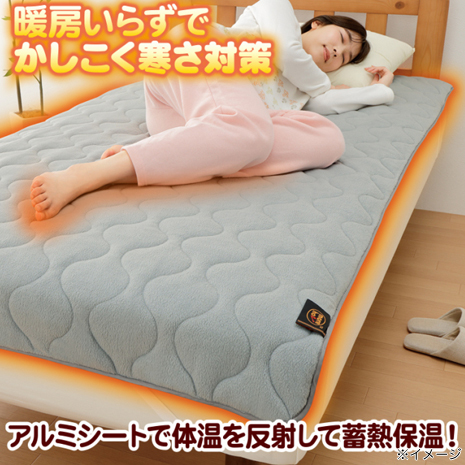 リピーター様のご要望にお応えし、定番のオレンジに加えて新色グレーが登場です。アルミシートで体熱を反射し、中わたで蓄熱保温します。アルミシート無しの場合と比較して約5.5℃も暖かく、電気毛布や暖房にたよらず節電して暖かく安全に過ごしたい方におすすめです。一度温まれば使用中は反射・蓄熱・保温の3つのループで全身ずっとポカポカ。通気性のある特殊加工したアルミシートのため蒸れにくく快適に安眠できます。アルミシートに中わたを両面からニードル加工をすることで、従来のアルミシート以上の蓄熱保温性とムレにくさを実現し、更にアルミシートによるシャカシャカ音も抑えます。お手入れは簡単で洗濯機で丸洗いOK、いつも清潔で快適に使用いただけます。四隅にズレ防止バンド付きで、寝返りをしてもズレにくい仕様です。冬の寒さにお困りの方、暖房費を節約したい方、底冷えでなかなか寝付けない方、電気毛布や暖房での乾燥が気になる方へオススメです。