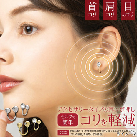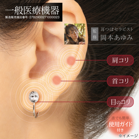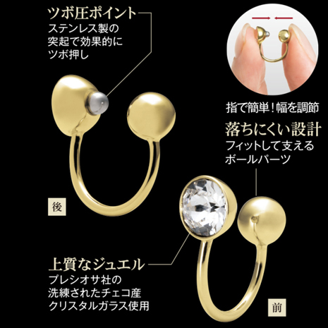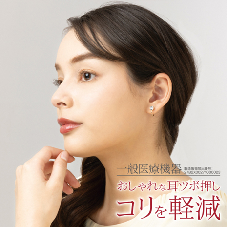 肩・首・目のコリが軽減できる一般医療機器のイヤーカフです。おしゃれな見た目でアクセサリーとして使え、コリや疲れも軽減できる一石二鳥なアイテムです。耳つぼに興味がある方に、サロンに行かなくても自宅で手軽に試せて繰り返し使用できるので、お財布にもやさしいです。ガラス部分は、プレシオサ社チェコ産のカットガラス使用でキラキラと上品な輝きです。耳に挟むときの強弱は調節できるため、耳のさまざまな部位につけることができます。シンプルなデザインだからお洋服を選ばずにオシャレのワンポイントにもご使用いただけます。
