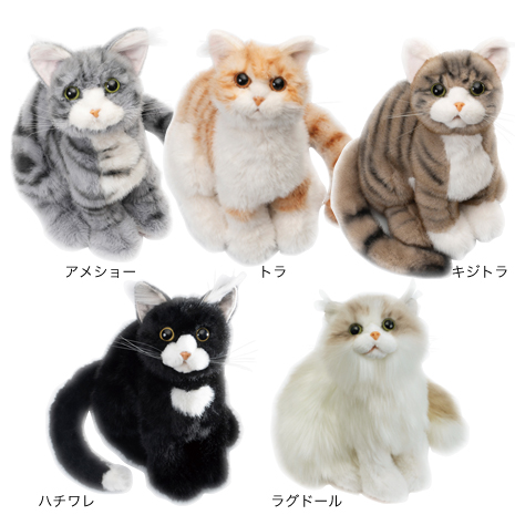 お座りなでなで子猫ちゃんは、猫のぬいぐるみの内部に、静電センサー(スマートフォンのパネルに使用されている)を頭やあご、背中、しっぽの4カ所に配置しており、撫でると触るの違いを感知して鳴き声を変えます。また、音センサーで呼べば応える機能付きです。丁寧な手作業で柄は手塗で制作していているため見た目もリアルです。本物の猫の声を録音しているので、鳴き声を聞くとまるで猫を飼っている気持ちになります。頭センサーを撫でると「にゃ~」触ると「にゃ~ぉ」、むねセンサーを触ると「ごろごろ」続けると「すやすや」、背中センサーを撫でると「みゃ~ぉ」触ると「なぁ~ぉ」、しっぽセンサーを握ると「ニャン!」握り続けると「うゎ~ぅ」と鳴きます。