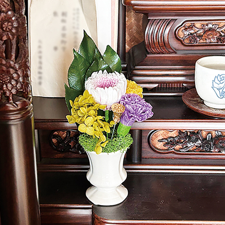 全てが天然素材の仏花です。プリザーブドフラワーを使っているので水やりが不要で美しく長持ちします。枯れたり腐ることもなく、交換回数が減り作業の手間が少なくなります。使用している花材は輪菊をメインに、仏花でよく使用されるものを選び、アレンジしています。花瓶を合わせてもコンパクトなサイズ感に収まるため、近年増加している卓上型の仏壇や、コンパクトで小さめの仏壇にも最適なサイズになっております。