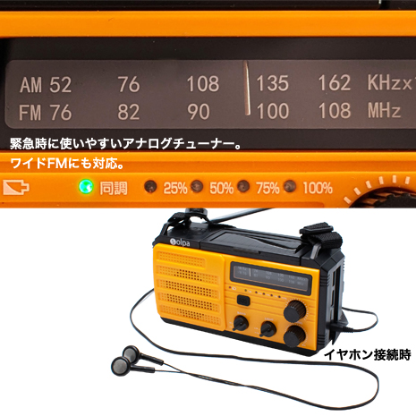 ※2:手回し充電:1分当たり約130から150回転させると発電が開始され、電池が空の状態から約12時間で電池残量約50%となります。