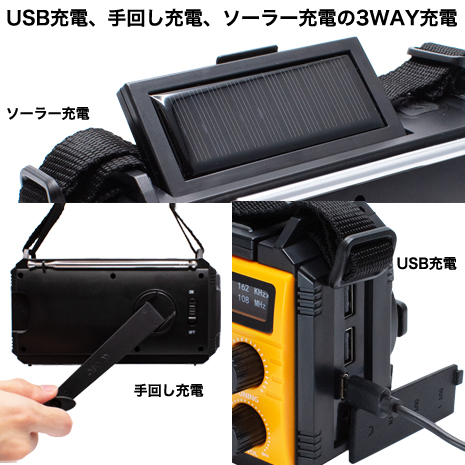 ◆3つの充電方法:USB充電/手回し充電/ソーラー充電