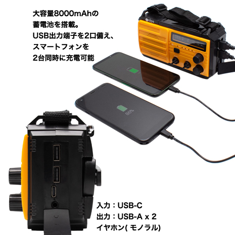 ◆1台5役:警報音、ラジオ、スマホ充電(大容量8000mAhの蓄電池を搭載。
