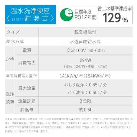・暖房便座標準表面温度:切…室温、〔3段切換〕低…約29℃(約29℃)/中…約33℃(約30℃)/高…約37℃(約33℃)
