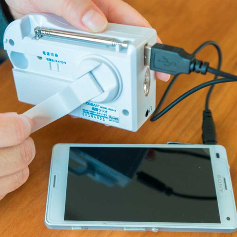 乾電池または手回しでスマートフォン、携帯電話の充電ができます。