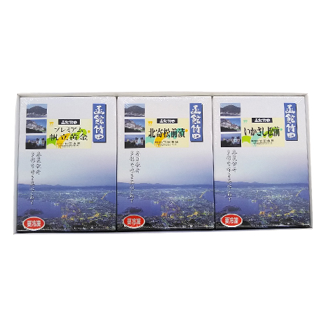 ■内容量:プレミアム帆立黄金200g箱、北寄松前漬200g箱、いかさし松前200g箱