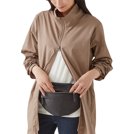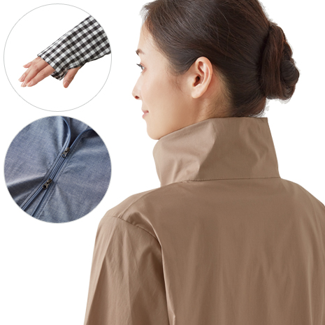 季節の変わり目や日差しが気になる季節に軽く羽織れるブルゾンです。お尻が隠れるロング丈。高めのスタンド襟で首をカバーします。袖口親指穴付きで手の甲も日差しから守ります。上下どちら側からも開けられるファスナーで、裾を開けると動きやすく、風も通りやすいです。紫外線遮へい率93%以上。