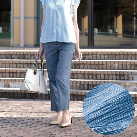 高島ちぢみは滋賀県高島地方で生産されている伝統的な織物。生地表面にシボ(凹凸)を作った独特の織物で、通気性・吸湿性があり、肌への接地面が少なく汗をかいてもベタつきにくい爽やかな着心地です。お腹まわりゆったり、足先に向かって細い美脚シルエット。