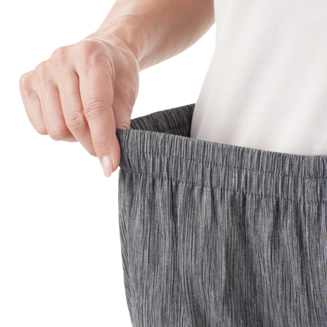 高島ちぢみは滋賀県高島地方で生産されている伝統的な織物。生地表面にシボ(凹凸)を作った独特の織物で、通気性・吸湿性があり、肌への接地面が少なく汗をかいてもベタつきにくい爽やかな着心地です。お腹まわりゆったり、足先に向かって細い美脚シルエット。