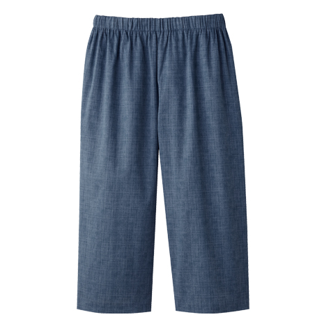 高島ちぢみは滋賀県高島地方で生産されている伝統的な織物。生地表面にシボ(凹凸)を作った独特の織物で、通気性・吸湿性があり、肌への接地面が少なく汗をかいてもベタつきにくい爽やかな着心地です。ヒップまわり、太ももまわりがゆったりした仕様ではき心地らくらく。ポケット付きでホームパンツとしてだけでなくちょっとした外出にもOK。