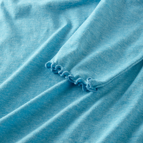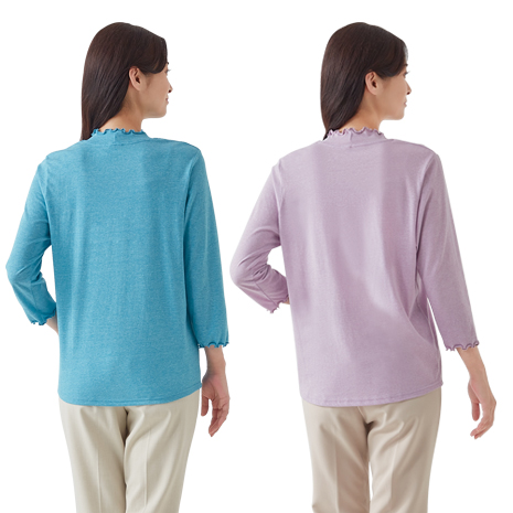 パンツにもスカートにも合わせやすく、お腹周りがすっきり見える丈感です。襟元と袖口はやさしいメロー使い。綿の優しさとポリエステルのさらりとした肌ざわりを併せ持つ着心地の良さ。ひじまで隠れる7分袖です。