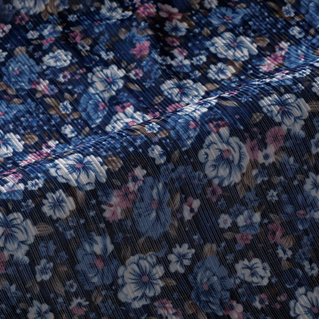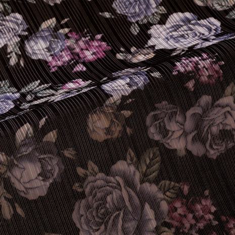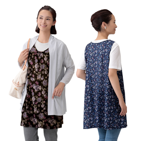 おしゃれに重ね着できる胸元ギャザーのフレアーチュニックです。Tシャツなどの上から着るだけで花やかな印象に。薄手でやわらかくシワになりにくい素材です。バラ柄ブラック系と小花柄ネイビー系の2色からお選びいただけます。便利な左右ポケット付きです。