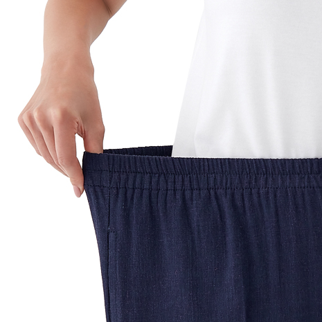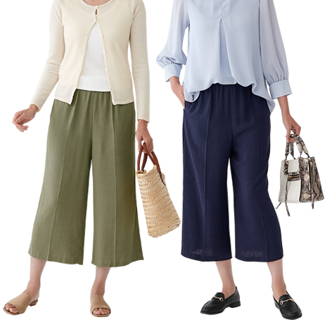 レーヨンと麻を使用したワイドパンツ。柔らかくさらっとした生地と広めの裾幅は動きやすく、外でも家でも着やすい便利な1枚です。7分丈のため涼やかな印象です。