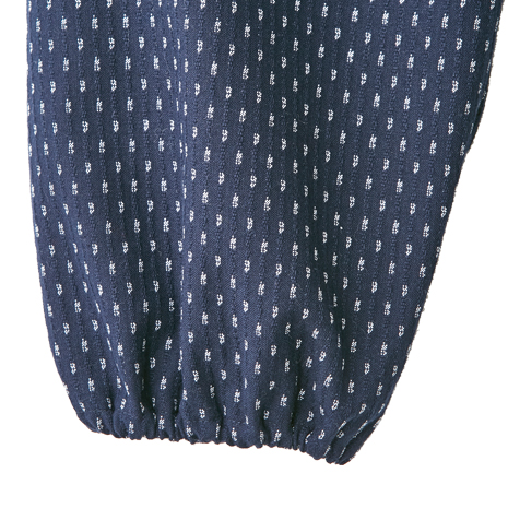ヒップや太ももまわりはゆったりで、お庭での作業や家事の時に快適なもんぺ。ウエスト総ゴムで楽な履き心地。裾が邪魔になりにくいゴム仕様で、丈の調整をしなくてもご着用いただけます。紺系のあられ柄で汚れが目立ちにくく丈夫な生地。作業中にも小物が取り出しやすい右前ポケット付きです。