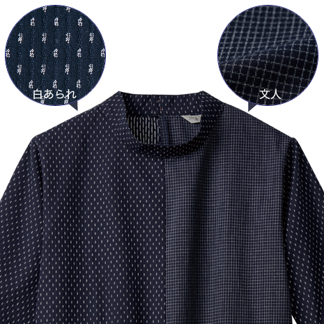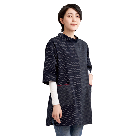 左右で異なる生地を使った切り替えデザインがおしゃれな久留米織チュニック。襟の後ろにボタンが付いているので、着脱がしやすくなっています。水仕事でも袖口が濡れにくい七分袖。汚れが目立ちにくく丈夫な生地。裾の左右スリット入りで動きやすい。