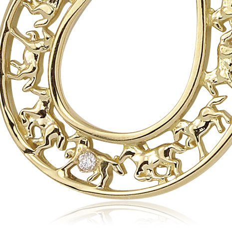 9頭の馬が左に駆け上がっているネックレスで、「右に出るものがない」という意味が込められています。馬が9頭で「馬九いく(うまくいく)」。9頭馬には開運・招福の意味が込められていて、古くから縁起物として親しまれています。トップはラッキーモチーフとして親しまれている「馬蹄」の形になっています。