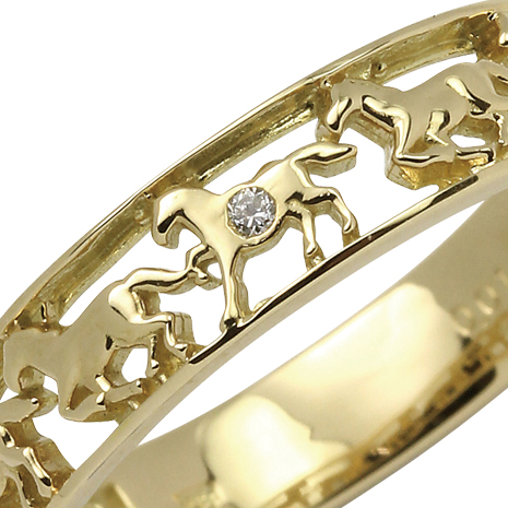 9頭の馬が左に駆け上がっているリングで、「右に出るものがない」という意味が込められています。馬が9頭で「馬九いく(うまくいく)」。9頭馬には開運・招福の意味が込められていて、古くから縁起物として親しまれています。モチーフの中の1カ所だけダイヤモンドが埋め込まれていて、18金とダイヤモンドの輝きが特徴の品です。