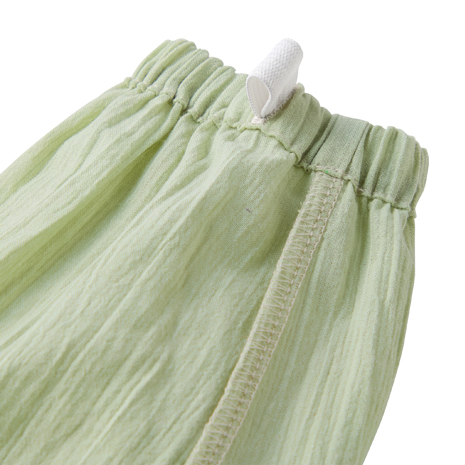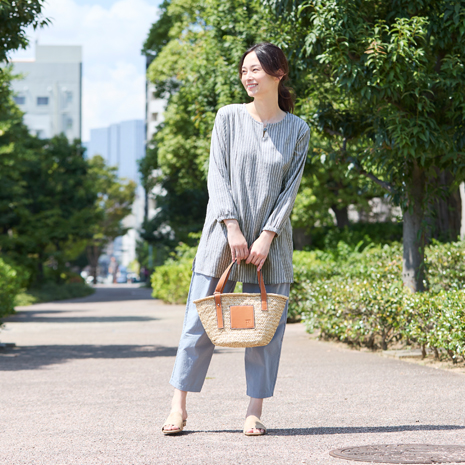 細かな縦ジワのある平織生地で、風通しが良く肌離れの良い楊柳素材を使用しています。ゆったりしたシルエットとお尻が隠れるロング丈で気になる体型をカバーします。袖口がゴム仕様の8分袖タイプで、家事や水仕事の際に袖を上げやすく便利です。
