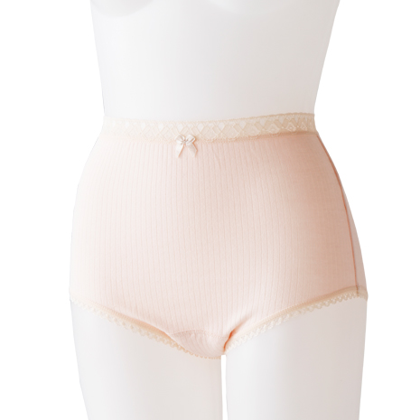 深ばきタイプの軽失禁対策ショーツ。吸水部分は4層構造で逆漏れしにくくなっています。身生地は綿100%でやさしい肌あたり。