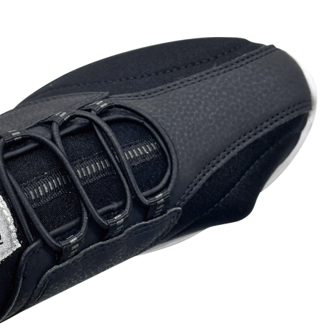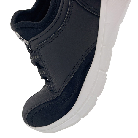 立ったままで、手を使わなくても履けるハンズフリー仕様のシューズです。甲部のゴム紐は結ぶ必要のない固定式。甲部の側面はストレッチ素材で伸縮性があるため、脱ぎ履きがしやすい構造になっています。足幅はゆったりとした4Eサイズの設計です。低反発インソールが足裏にフィットするのでソフトな履き心地です。アウトソールはクッション性と屈曲性に優れているため、地面からの衝撃を和らげるような構造になっています。