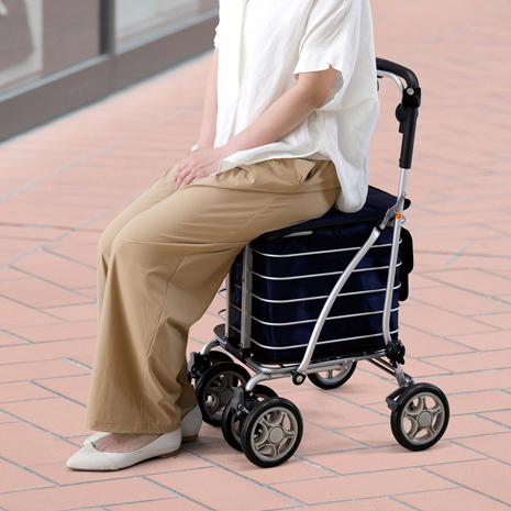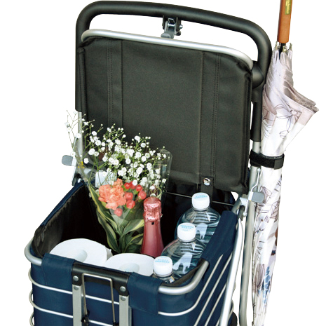 スーパーの買い物かごが載せられてカートを使う必要がなくお買い物が便利でスムーズに。疲れたら駐車ブレーキをかけて座ってひと休み。ハンドル高さは3段階に調節可能です。ハンドブレーキ・駐車ブレーキロックがついているから安心。折りたたみ式だから使用しない時はコンパクトに収納が可能です。ハンドルの側面には傘立てホルダーがついていて立てかけて使えます。