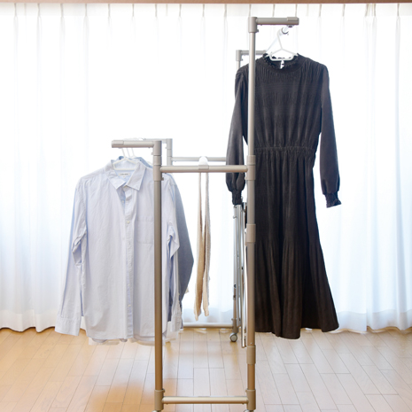 洗濯物に合わせて高さや幅を調整可能、シーツも広げて干すことができます。使わないときはコンパクトに収納可能です。キャスター付きで移動もラクラク。