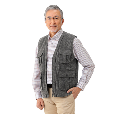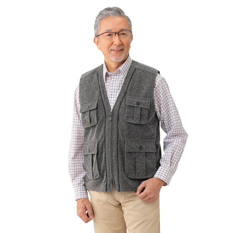 高級感のある素材がおしゃれなベスト。マチ付きポケットでたっぷり収納。充実したポケット機能で、お出かけからカメラやハイキングなど趣味にも最適です。