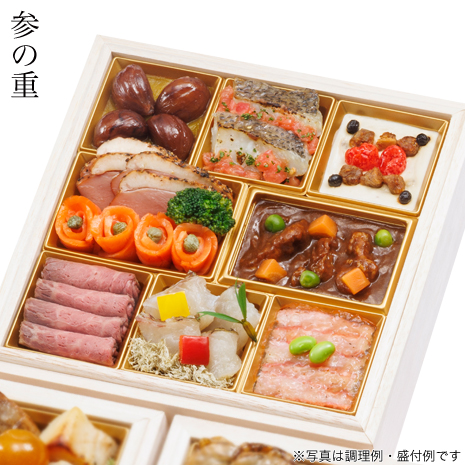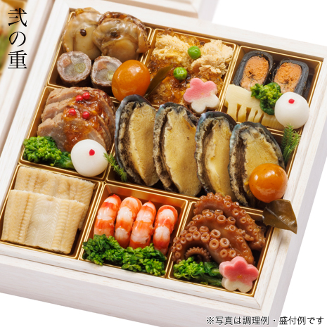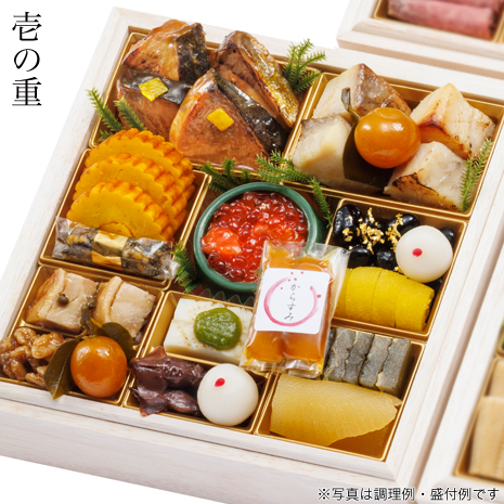 鰤照焼、大根田舎煮、銀鱈西京焼、きんぴらごぼう、葉付き金柑、伊達巻柚子風味、田作りカシューナッツ和え、鮭ルイベいくら掛け、からすみ、黒豆金箔、網笠柚子、柚子餡餅、さわやか健味鶏の山椒焼、くるみ甘露煮、炙り烏賊の翡翠味噌掛け、ほたるいかしぐれ煮、かじき昆布〆、数の子醤油漬