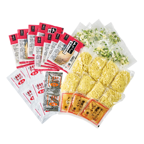 ■内容量:生麺120g×8、醤油スープ35g×6、味噌スープ41g×2、チャーシュー15g×8、乾燥ねぎ1g×8、味付メンマ50g×3