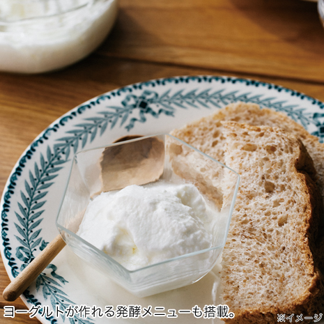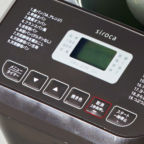 メニュー:1.食パン、1A.アレンジ食パン、2.早焼きパン、3.糖質オフパン、4.フランスパン風、5.全粒粉パン、6.米粉パン(グルテンなし)、7.天然酵母生種おこし、8.天然酵母パン生地、9.天然酵母パン、10.こねる、11.発酵、12.焼く、13.パン生地、14.ピザ生地、15.もちつき、16.ケーキ、17.ヨーグルト、18.さらさら甘酒、19.つぶつぶ甘酒