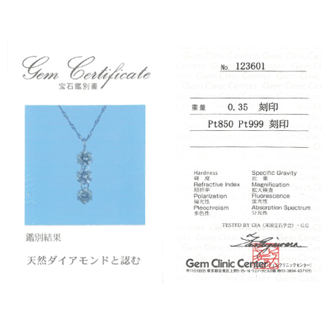 純プラチナ枠0.35ctダイヤモンド3ストーンペンダント