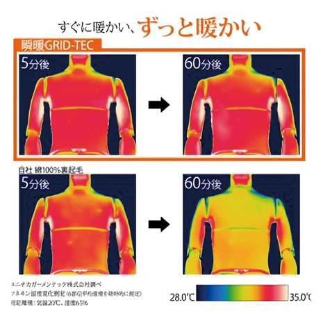 ●肌側の微起毛のGRID構造が空気の層を作り、外気の冷たい空気をシャットダウンし、体温を外に逃がしません。