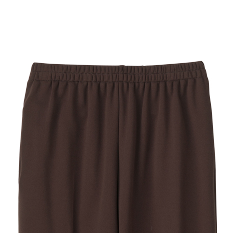 裏起毛のニット素材を使用したしゃがんでもラクラクのあったかパンツ。裾内側にはファスナーが付いているので、脚の診察時にも便利です。脱ぎ着がしやすく、おなかを締め付けにくい総ゴム仕様もポイント。定番カラーのモカとブラックで、一本あると着回しにも活躍します。