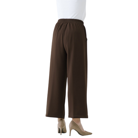動きやすいゆとりのあるデザインで、スラッとした脚長シルエットのワイドパンツです。毛足の長い裏シャギー素材でふんわりやわらかな肌あたりです。ウエストの総ゴムとゆとりのあるヒップまわりで、はき心地ラクラク。伸縮性のあるニット素材だから動きやすいのもポイントです。