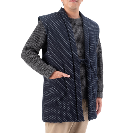 中わたがしっかり詰まった久留米織のちゃんちゃんこ。生地の織りから、わた入れ・縫製に至るまで一貫した国内生産です。袖がないので動きやすく、水仕事なども便利です。お尻まですっぽり覆う長めの丈。
