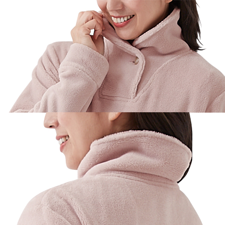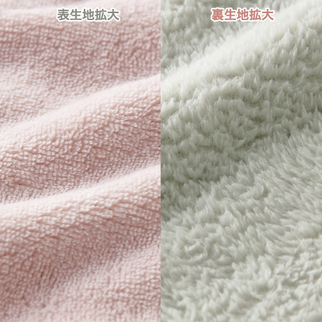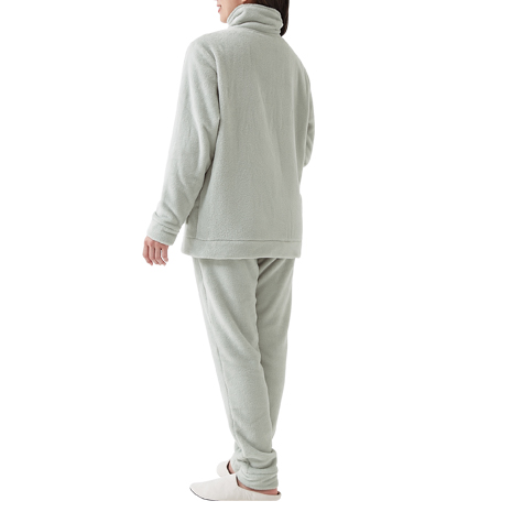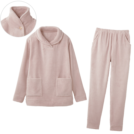 毛布のようにふわふわで、もこもこした素材を使用しており、寒い季節のパジャマやルームウェアに最適です。袖口、裾口は冷気が入りにくいように生地を切り替えています。ウエストゴムは取替可能で、上衣・パンツどちらにもポケットが付いているので着回しに便利です。