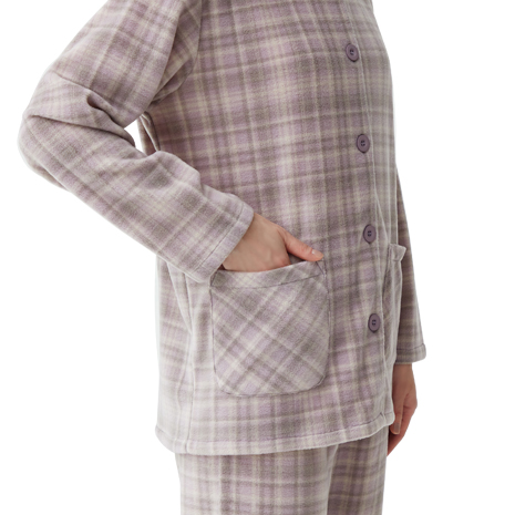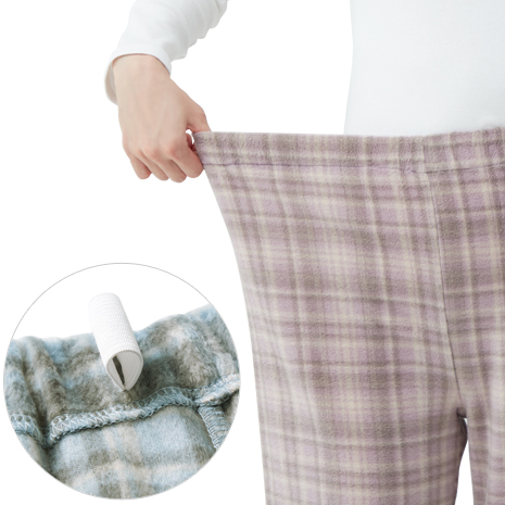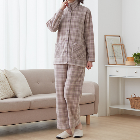 軽くて柔らかなフリース素材を使用したパジャマです。ボタンを上まで留めると、襟が首もとを包み込んで暖かいです。ウエストゴムは取替可能で、約2cmの大きめボタンで留め外しもラクラクです。